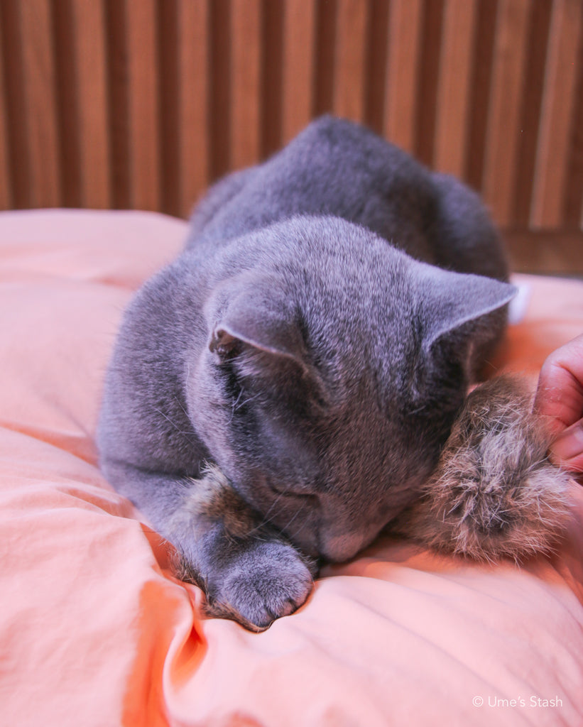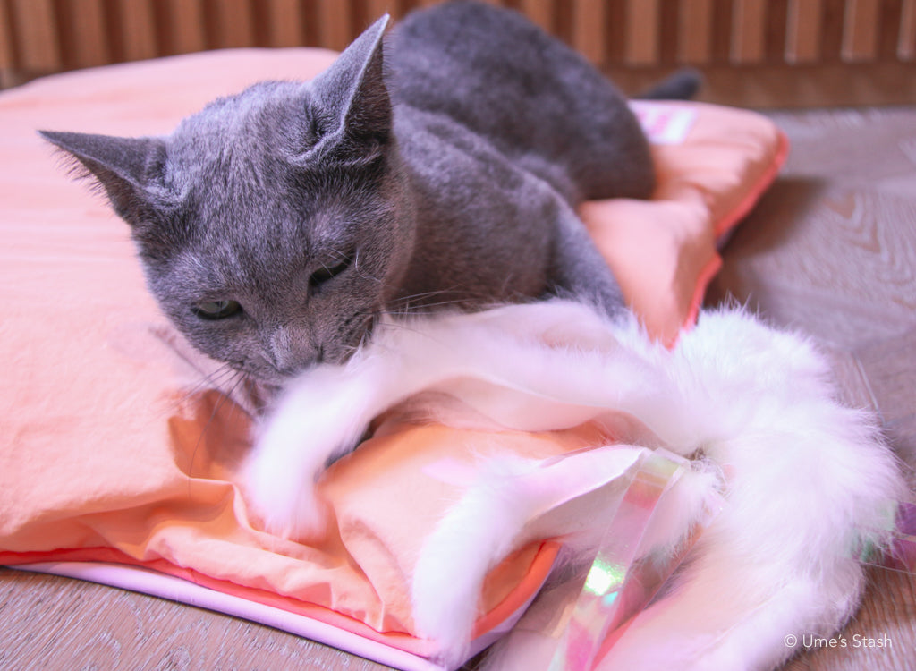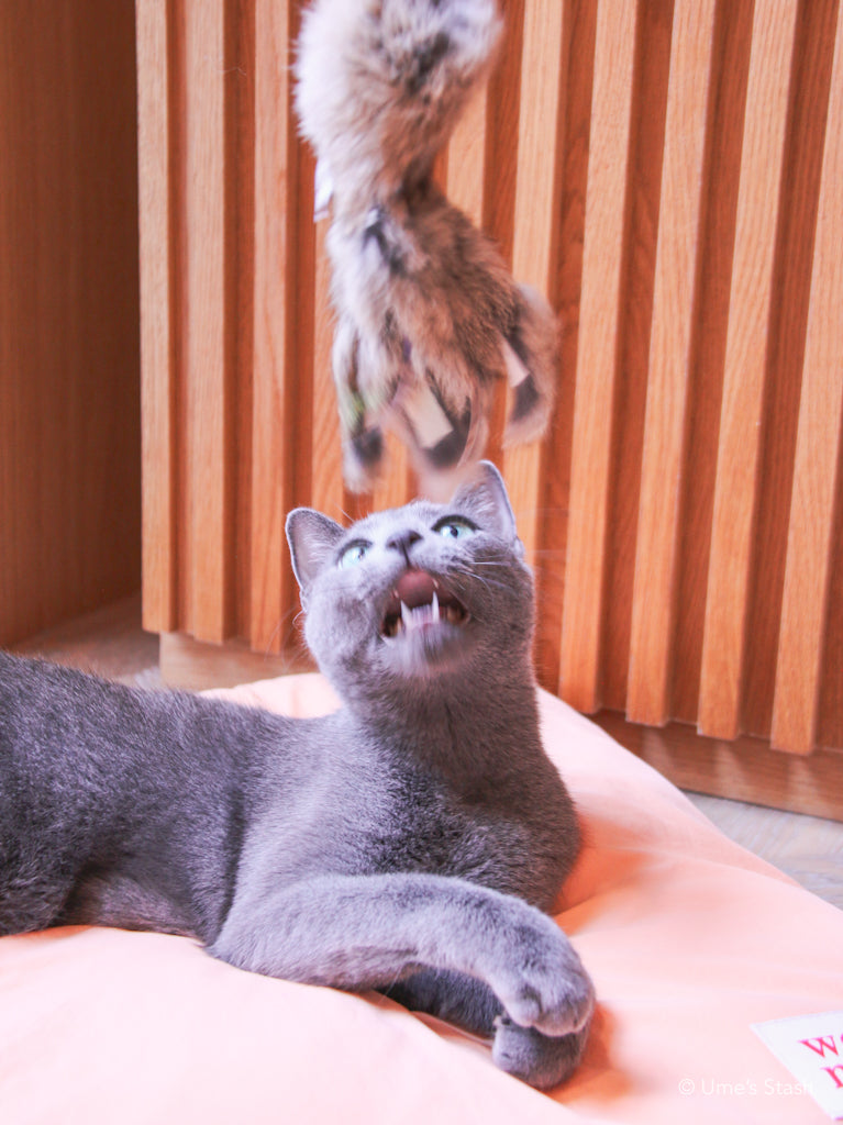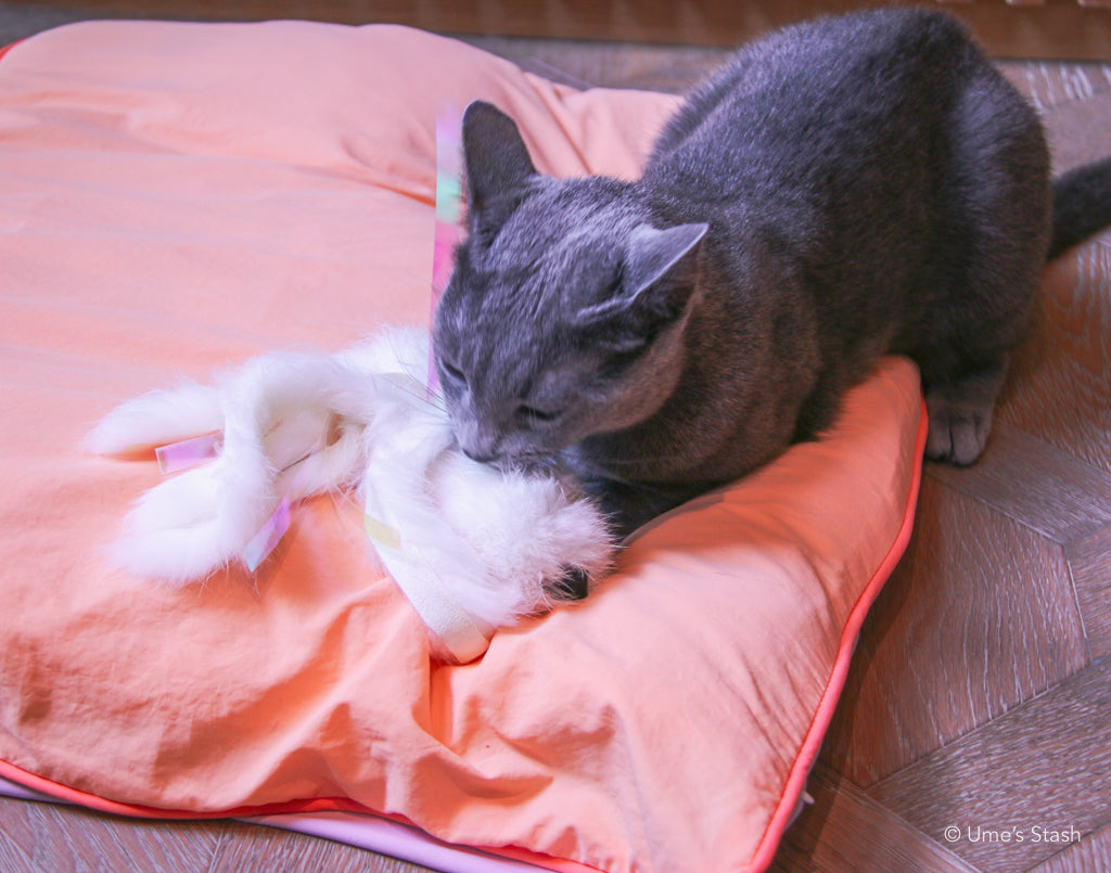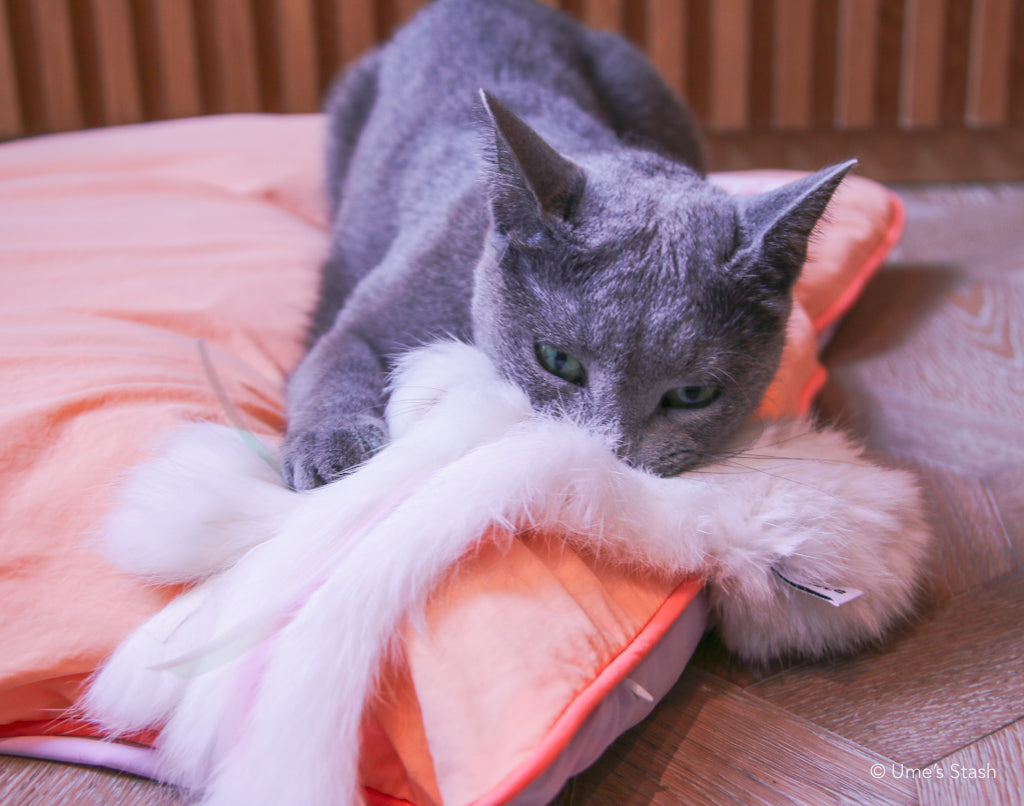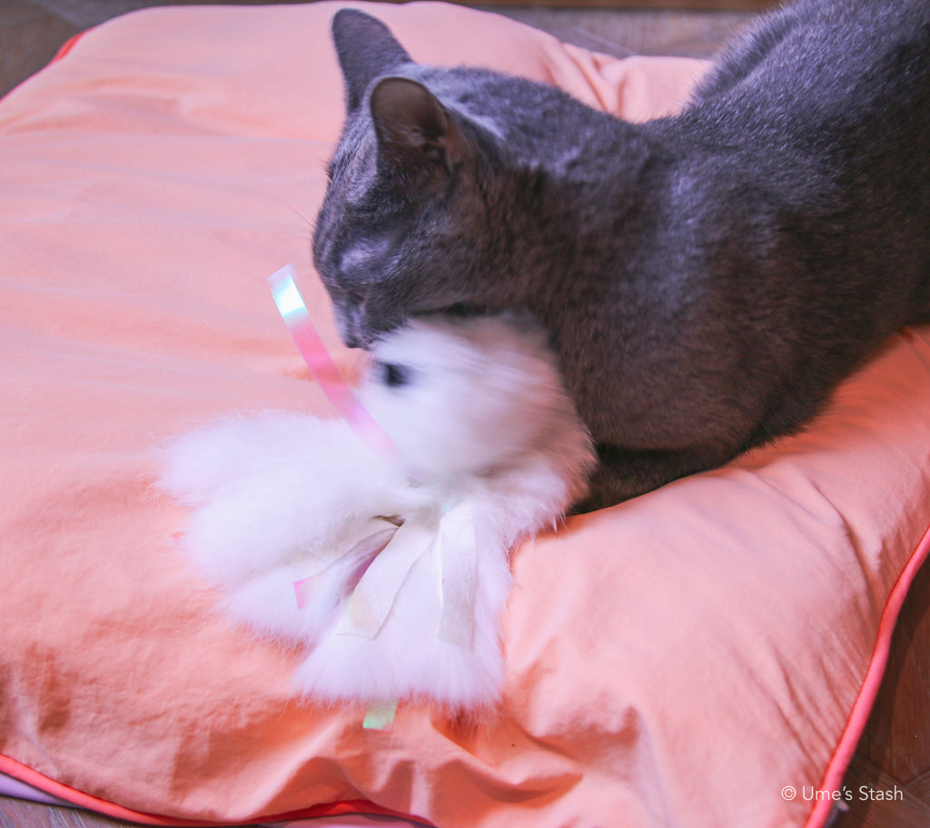 Enticing scent: Real rabbit fur ball that will trigger any cat’s predatory instincts. Just like real prey.