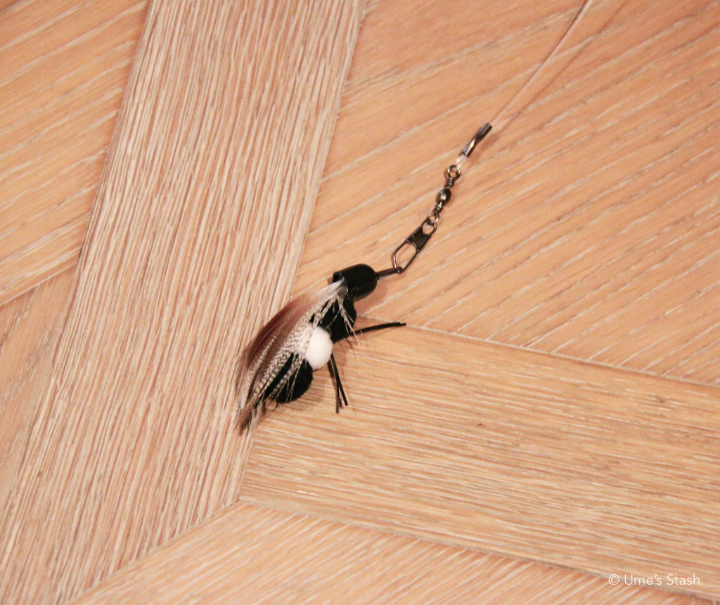 Super long wand with fishing line for extra fun: With an extendable body together with a swishing long line, the Lightning cat wand is guaranteed to get your cat running and chasing all around. Comes with a insect-shaped attachment with real feathers.